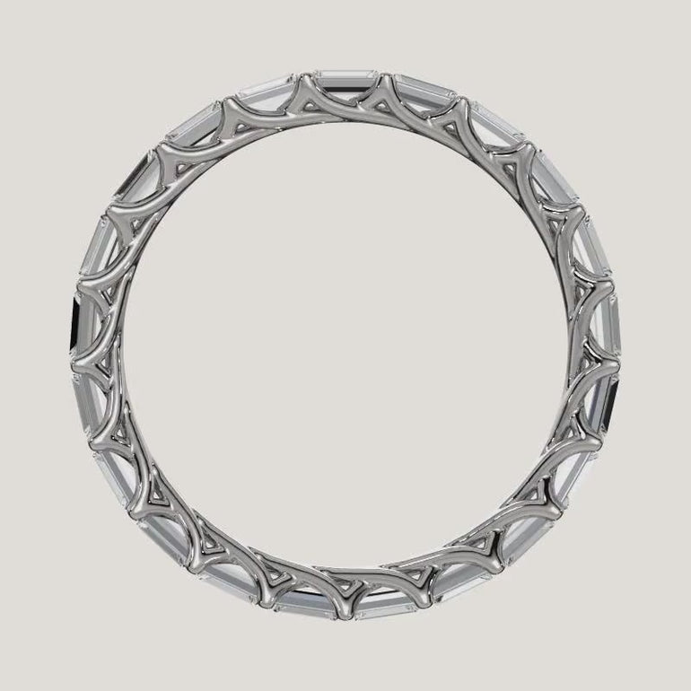 This striking Eternity Band features sleek baguette-cut diamonds set in a seamless, modern silhouette. An open filigree gallery adds intricate detail and lightness beneath the brilliance.