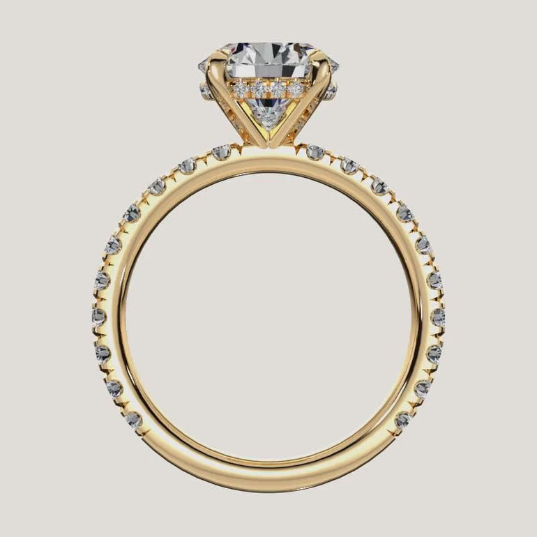 Minimal in form, intentional in meaning—The Trelisse is a sculptural solitaire with hidden halo containing 3/4 diamonds ring designed for devoted love you share. Its clean lines draw focus to the center stone, while a hidden Vowpoint™—our signature triangle-cut diamond—rests between the prongs, symbolizing the promise only you two share and the journey of past present and future.