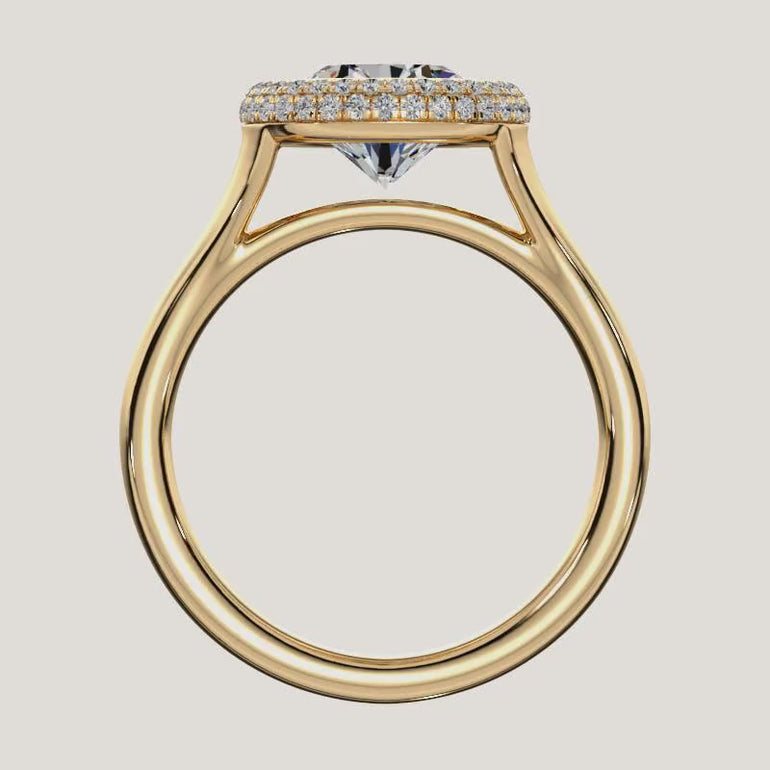 The Lunea features a floating East–West bezel and radiant Solara Halo that cradle the center stone like a rising moon—soft yet secure. Its pillowed form is sculpted for comfort and elegance, resting gently on the hand. Modern yet timeless, it captures light with effortless grace. A bold expression of simplicity, protection, and harmony.
