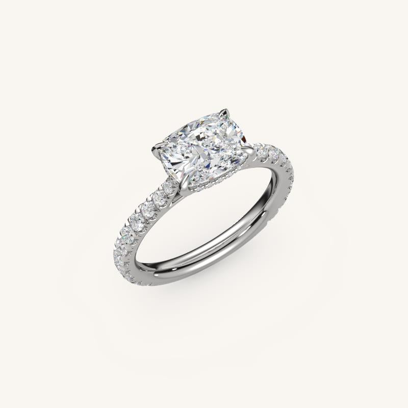A design that rises with intention, The Solienne features an airy cathedral silhouette and a hidden halo of ¾ diamonds. The East-West set center stone is elevated with strength and grace. Beneath the setting lies our signature Vowpoint™—a discreet triangle-cut diamond—A deeply personal symbol of love, known only to the two of you.