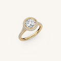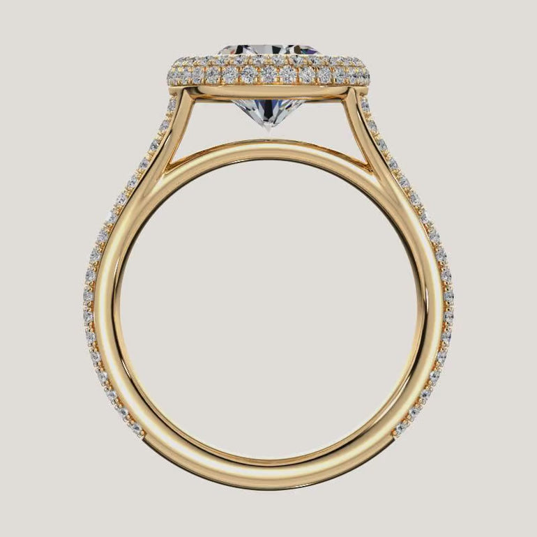 The Lunea features a floating bezel and Solara Halo with ¾ pavé diamonds, cradling the East–West set center stone like a rising moon—soft yet secure.